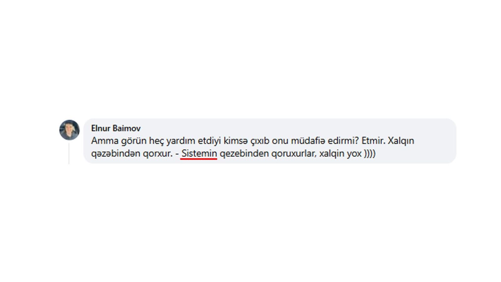 E.Baimov barədə bütün bunları yazmaqda məqsədim A.Əhmədzadənin həbsindən sonra onun yazdığı şərhə diqqət çəkməkdir. O, A.Əhmədzadənin dostları tərəfindən müdafiə olunmaması ilə bağlı yazılan statusa belə bir şərh yazmaqla, sistemə qarşı (oxu: dövlətə, hakimiyyətə) müxalif münasibətini sərgiləyir. Sistemin qəzəbini və bütün problemlərin məhz sistemdən qaynaqlandığını önə çəkir (Əsas foto). Təbii ki, E.Baimovun son davranışları A.Əhmədzadənin həbsini siyasiləşdirməyə cəhd etdiyinin açıq ifadəsidir.