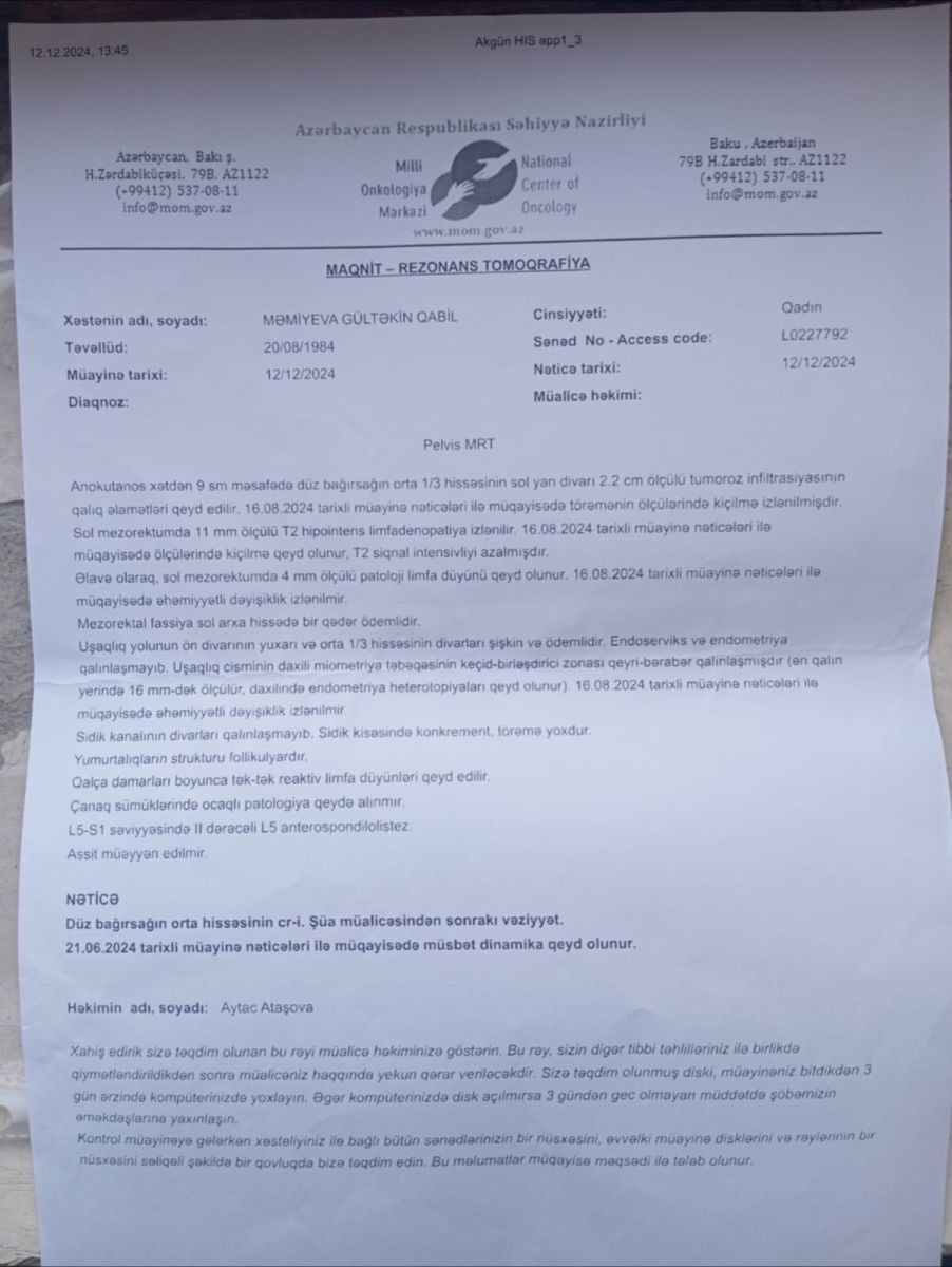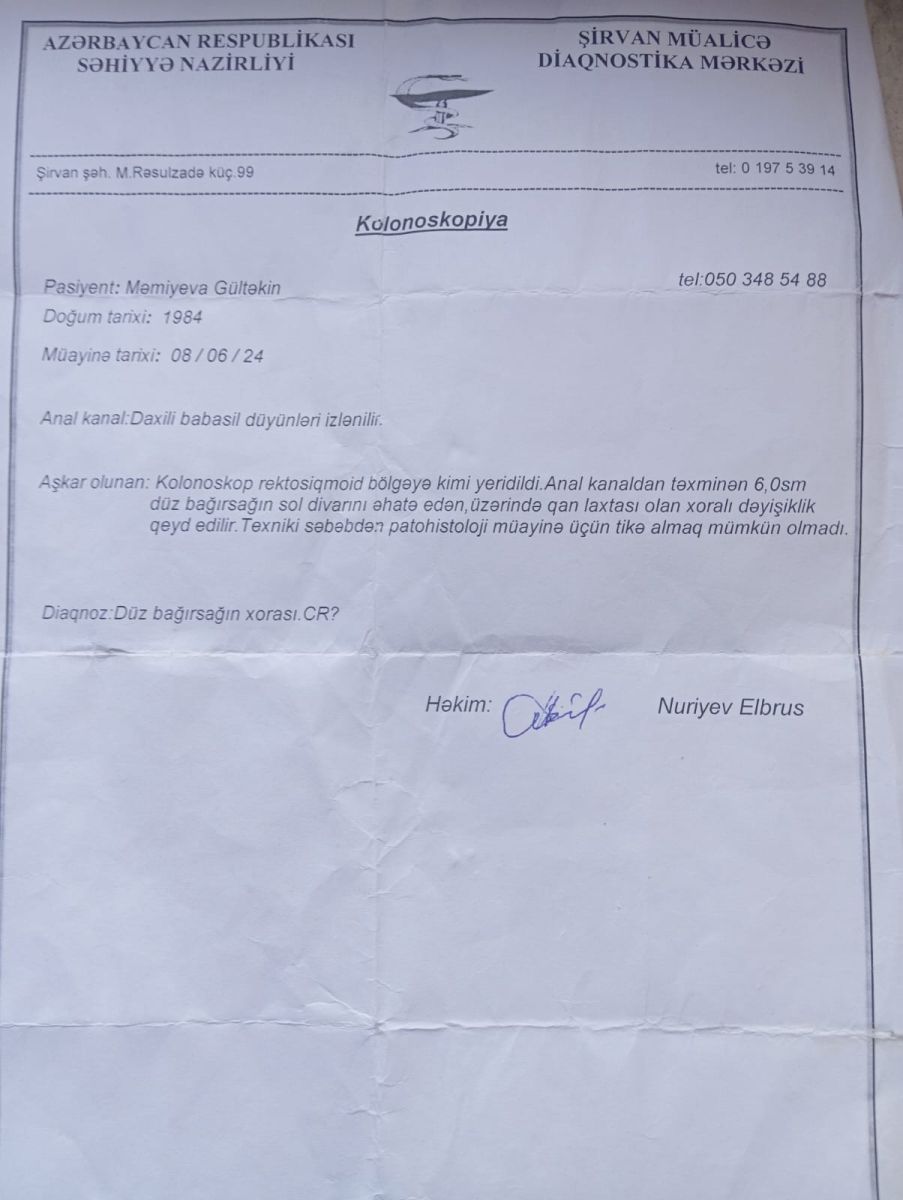 2024-cü ildə həyat yoldaşım Məmiyeva Gültəkin Qabil qızını güclü qanaxma ilə xəstəxanaya apardım. Şirvan Mərkəzi Xəstəxanasında Kolonoskopiya etdikdən sonra bağırsaqda şiş olduğu aşkarlandı. Bizi Bakı şəhəri M.A.Topcubaşov adına xəstəxanaya göndərdilər. Orada da yernidən Kolonoskopiya etdilər. Daha sonra biopsiya analizi götürdülər və bizi Milli Onkologiya Mərkəzinə göndərdilər. Burada həyat yoldaşım 4 dəfə kimyaterapiya olundu. 26 gün şüa verdilər. 3 aydan sonra isə əməliyyat edib, şişi götürdülər.