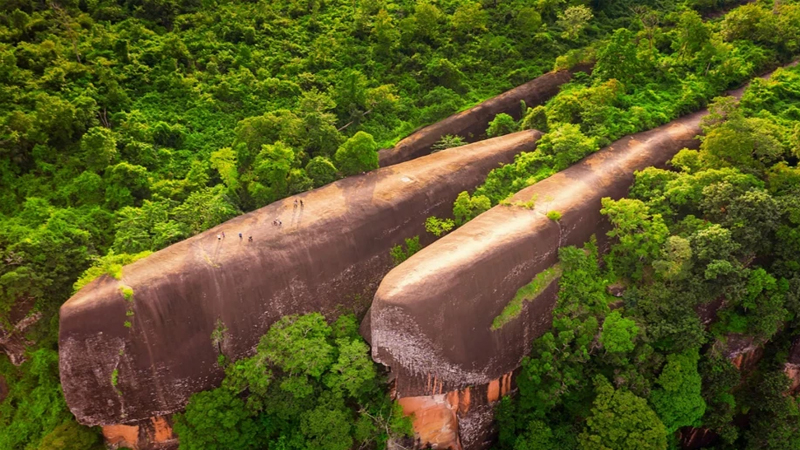 Tailandın şimal-şərqində sıx meşəliklərin arasında ucalan üç nəhəng qaya kütləsi ilk baxışda adi bir təbii quruluş təsiri bağışlaya bilər. Lakin göydən və ya yüksək bir nöqtədən baxıldıqda bu qayalar, yan-yana üzən balina ailəsini xatırladan görünüşləri ilə diqqət çəkir. Min illər boyu külək, yağış və zamanın təsiri ilə formalaşan qayalar, sanki təbiətin səbrli əlləri ilə oyulmuş kimidir. Yerli əhalinin "Three Whale Rock” - "Üç balina qayası” adlandırdığı bu təsirli quruluş həm təbii gözəlliyi, həm də geoloji əhəmiyyəti ilə seçilir.