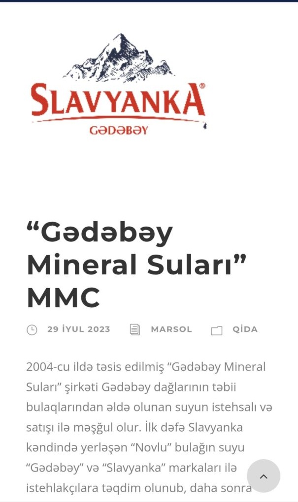 Qeyd edək ki, şirkətlə bağlı məlumatda "2004-cu ildə təsis edilmiş “Gədəbəy Mineral Suları” şirkəti Gədəbəy dağlarının təbii bulaqlarından əldə olunan suyun istehsalı və satışı ilə məşğul olur. İlk dəfə Slavyanka kəndində yerləşən “Novlu” bulağın suyu “Gədəbəy” və “Slavyanka” markaları ilə istehlakçılara təqdim olunub, daha sonra digər bulaqlardan istifadə edilməyə başlanılıb" deyə bildirilib.